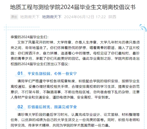 以身护人,守牢安全健康之本。加强毕业生离校期间安全教育,举办毕业生安全教育主题班会,强化学生安全意识;发布2024届毕业生文明离校倡议书,倡导广大毕业生文明离校,自觉维护学校教学、生活秩序;学院领导与学生工作干部深入毕业生班级及宿舍,开展广泛而深入的交流谈心活动,倾听毕业生的心声,细致了解每位学生在离校前夕所面临的挑战与困惑,为毕业生排忧解难,确保离校过程顺畅安心。