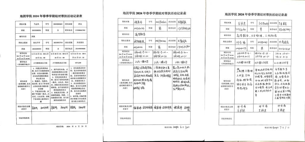 积极响应落实学校《关于开展学生朋辈学业帮扶工作的通知》,及各项学风建设和学业帮扶办法文件精神,朋辈帮扶志愿者报名人数达本科生总数10.5%,经筛选后上报学业优秀志愿者共124人;帮辅工作中,活用学生课程辅导资源,调研统计学生重点帮扶需求课程,深入了解帮扶志愿者优势科目,细致安排课程重点难点精讲,兼顾安排课程总体知识梳理;充分利用课外闲余时间,合理安排志愿者排班,设置课程帮辅答疑晚自习;认知递接,发挥学生干部班级工作组织管理优势,班级自主开展重难点课程辅导讲解。四项帮辅工作协同并进,切实做到重难点讲解、课程总体梳理、班级自主辅导和晚自习答疑全覆盖,力求全方位满足学生课程辅导需求。