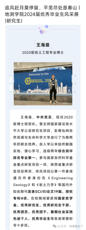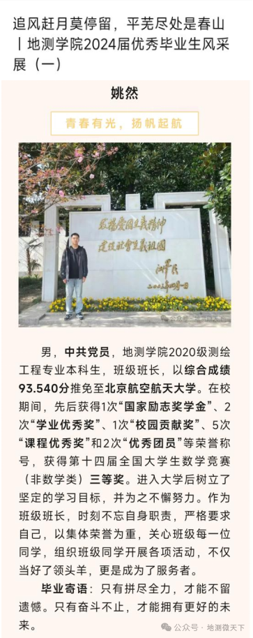 为充分发挥先进典型的示范引领作用,加强对广大学生的励志教育,激励他们以优秀为标杆,积极向榜样看齐,学院精心策划了“诚信与资助”文化节系列活动之“优秀毕业生风采展”,希望通过优秀毕业生的事迹,鼓舞和激励地测学子奋勇争先、追逐梦想