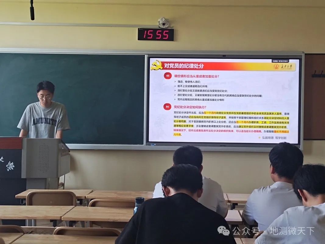 为深入学习《中国共产党纪律处分条例》,切实落实好习近平总书记在中国共产党第二十届中央纪律检查委员会第三次全体会议的重要讲话精神,2024年5月13日下午,2023级测绘专硕党支部于williamhill英国中文官网楼406教室举行了《中国共产党纪律处分条例》党纪学习教育。学习会由龚浩冉同志主讲,全体支部党员参与。