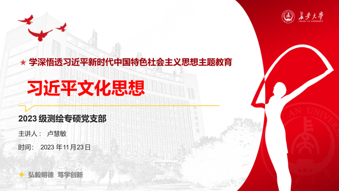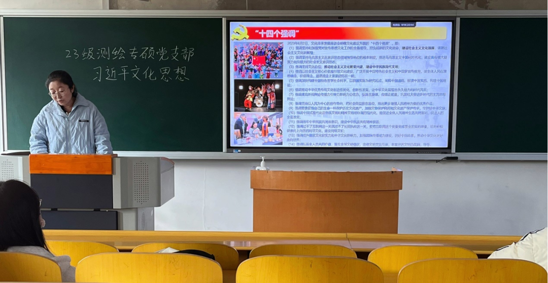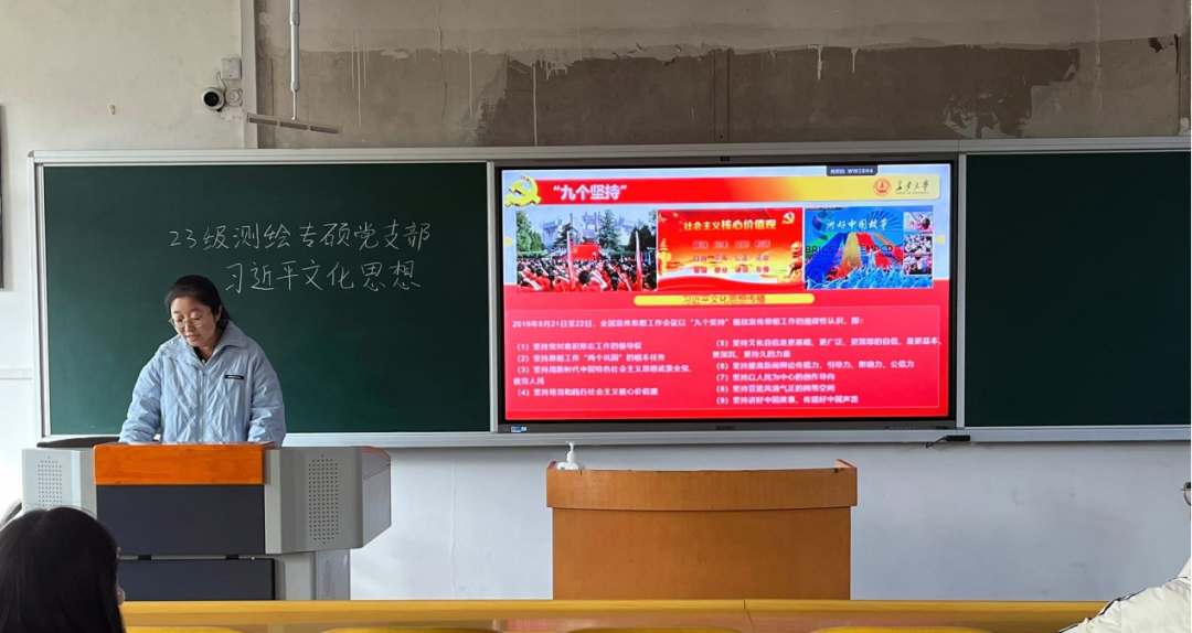 2023年10月7日至8日,全国宣传思想文化工作会议在北京召开。会议最重要的成果就是首次提出了习近平文化思想。习近平新时代中国特色社会主义思想的文化篇,在马克思主义中国化时代化进程中浓墨重彩、熠熠生辉。近日,williamhill英国中文官网2023级测绘专硕党支部以“习近平文化思想”为主题,进行针对性学习。此次主题学习由党支部书记卢慧敏同志进行讲解,全体党支部成员参与学习。