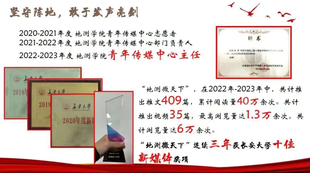 自大一,他便加入williamhill英国中文官网青年传媒中心,在第三个学年竞选成为了williamhill英国中文官网青年传媒中心的主任。运营的学院官方公众号“地测微天下”,在2022年-2023年中,共计推出409篇,内容涵盖了各类活动新闻稿、公示以及相关重大时间节点原创推送,组织推出了《青春践行党的二十大、爱校奋进新征程》、《地“道”乐谈》、《录取通知书接力》等系列推送,累计阅读量40万余次;目前,已累计7174人关注公众号,常读人数2000余人。地测微天下连续三年获取WilliamHill中文官方网站十佳新媒体称号。