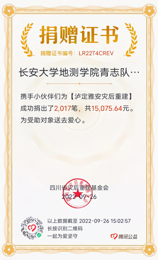 2022年9月5日,四川甘孜州泸定县发生6.8级地震,国家地震应急三级响应!国家四级救灾应急响应!得知此消息,williamhill英国中文官网青年志愿者服务队在第一时间寻找相关募捐机构,在成功找到相关渠道后,以williamhill英国中文官网青志队组织的名义开展募捐活动。此次活动受到同学们的大力支持与赞扬,截至9月24日22:37,williamhill英国中文官网青志队一共成功为四川省灾后重建基金会募集捐款2017笔,共15075.64元。