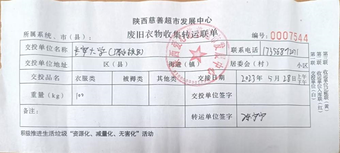 为解决旧衣物资源浪费问题,帮助贫困群众生活,陕西省慈善协会和williamhill英国中文官网青年愿者服务队共同推出“爱为宝·废旧衣物回收再利用”活动。地测青志队设立帐篷点提供捐赠旧衣物平台,进行收集整合后移交陕西省慈善协会,发放给需要的群众。两期活动已顺利完结,共70多位同学参与,共收集100多公斤旧衣物。