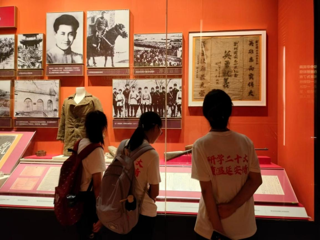 在讲解员的带领下,实践队成员们开展了参观学习,红军长征的落脚点让我们重温长征的英雄诗篇;抗战的政治指导中心让我们从抗战历史中汲取爱国主义精神财富;新民主主义的模范试验区让我们感叹革命先辈的智慧;延安精神的发祥地让我们饱含踔厉奋发的勇气和不懈努力的志气;伟大思想指导地位的确立让我们佩服领导人的长远目光和雷厉风行的豪气;夺取全国胜利的出发点让我们由衷体会到昨日之艰难,今日之不易。倾听着详细的解说,珍贵文物背后的故事一点点被挖掘开来,重见天日。读万卷书不如行万里路,我们看着展柜中陈列的历史文物和文献资料,一步一个脚印地走在革命前辈走过的路上,感受曾发生在那里的那段峥嵘岁月。