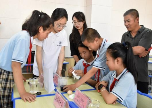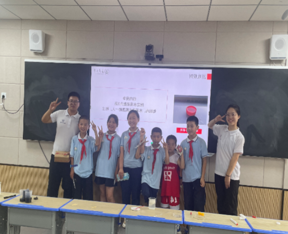 实践队队员刘岩用简单的话语,用生动有趣的授课方式,带动同学们做实验的积极性。实验过程中,实践队队员为实验完成效果好和积极主动回答问题的同学发放奖励,鼓励同学们积极发言、敢于动手,在同学们心中种下一颗科学的种子,激发他们探究科学知识真理的兴趣。