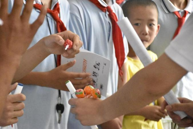 在讲解结束后,实践队队员组织同学们在展板前集合。为使同学们深入学习科普知识,暑期实践队队员们准备了六个已讲解的问题,同学们在回答问题后,可以获得实践队准备的小奖品。