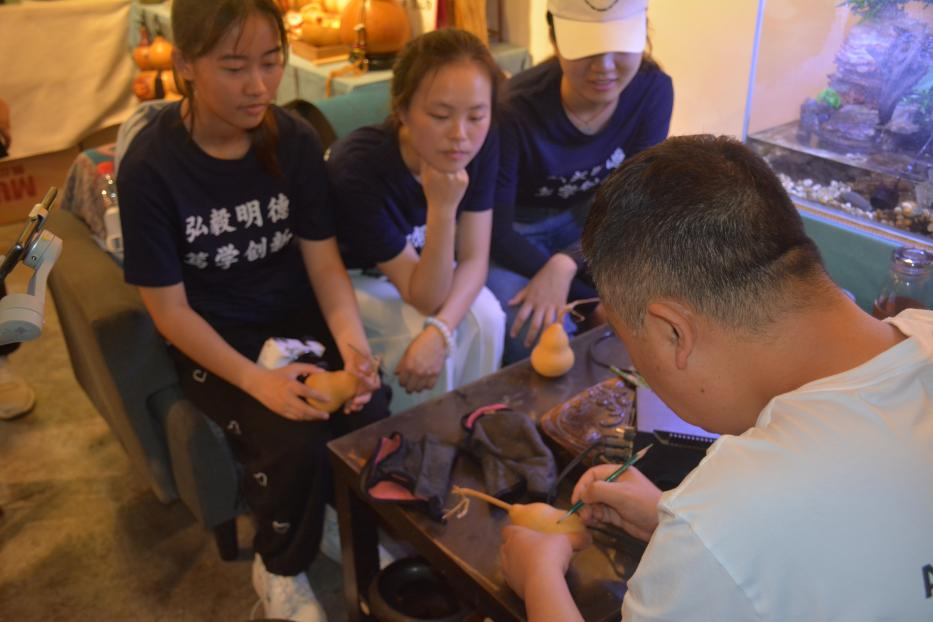 调研完皮影戏后,实践队又来到了当地葫芦坊进行走访调查。葫芦画是一种古老的传统工艺美术品。在葫芦上刻画和装饰的艺术称为“葫艺”。实践团队来到袁家村“葫芦坊”,通过采访葫芦坊老板,队员们了解到在葫芦上赋诗作画、进行艺术创作能表达富贵平安、福寿绵延、多子多福等美好祝愿。实践队员还在师傅的指导下,亲自体验在葫芦上绘画,深深感受到了葫芦画艺术的乐趣。