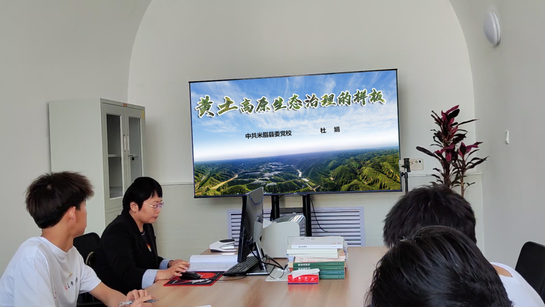 上午9时,实践队成员在中共米脂县委党校副校长杜鹃的带领下进行了“黄土高原生态治理的样板”主题团课学习。在主题团课上,杜副校长从黄土高原生态治理的奋斗历程、黄土高原生态治理的经验启示、黄土高原生态治理的崭新篇章三个部分详致地讲述了米脂县高西沟村三代人四个领导班子接续奋斗、将生态治理进行到底并且取得明显成效的优秀模板,展现出高西沟村在生态治理、创新特色农业发展方面的巨大成效。主题团课学习结束后,实践队成员就米脂县农业发展、文化遗产、科技创新等切合民生的问题对杜副校长进行了提问,杜副校长对此逐一进行了详细的回答,让实践队成员对米脂县的基础状况有了更为深刻的了解,对“坚持不懈、与时俱进、协调发展”的新时代高西沟精神有了更加透彻的认知。