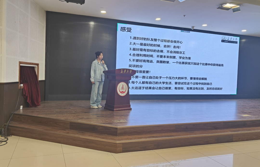 张晓敏就自身竞赛经历展开宣讲,从确定参赛类型、寻找团队成员、寻找指导老师、完成参赛项目、进行学院申报五个方面对参加比赛的流程及准备进行了细致的讲解,并推荐同学们参赛作品最好能以实物的方式展示,以便给评委以直观的感受,除此之外,她还强调了一些申报书填写的注意事项。