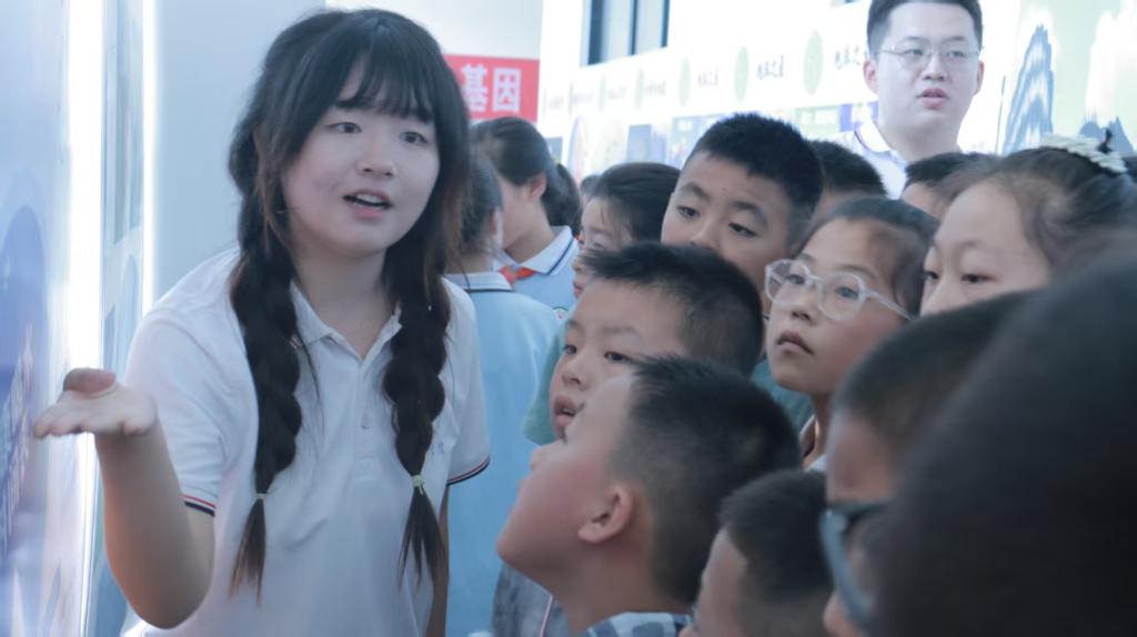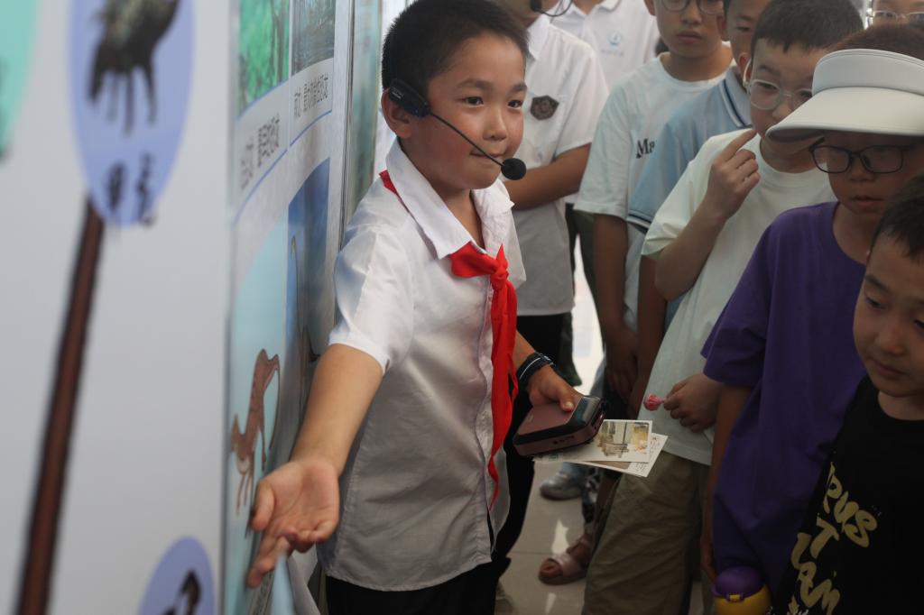 52块展板沿长廊呈“S”形排开,主题自“地球诞生”一路铺陈至“恐龙灭绝”,又由“水的分布”延伸至“生命起源”。7月14日上午8点30分,WilliamHill中文官方网站实践队员与北辰小学12名“小小讲解员”并肩而立:大学生以专业知识为基础,辅以图片、数据、真实案例,将抽象概念“翻译”成通俗语言;小学生则接过话筒,独立完成讲解,并主动向观众抛出“知识小问答”——答对者即可领取实践队精心准备的奖品。童声与青年学子的声音此起彼伏,现场互动热烈,展板前人头攒动。