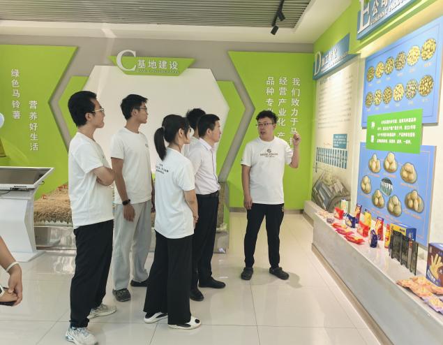 实践队随后走访中晟陇源农业有限公司、福景堂农业集团等企业,深入了解马铃薯产业链延伸成果。在深加工环节,马铃薯经过清洗、去皮、人工分拣、高压水切片、蒸煮制泥、脱水烘干等工序,转化为淀粉、薯片、薯条等多元产品,实现价值倍增。企业通过“党建+公司+基地+农户”模式,既保障原料供应的绿色安全,又带动周边农户共享产业链红利,形成党建引领下的产业协同发展格局。福景堂农业集团的综合展示厅,进一步展现了龙头企业在产业布局、技术创新与绿色发展上的示范作用,凸显了党建引领对产业融合的推动。
