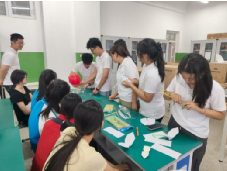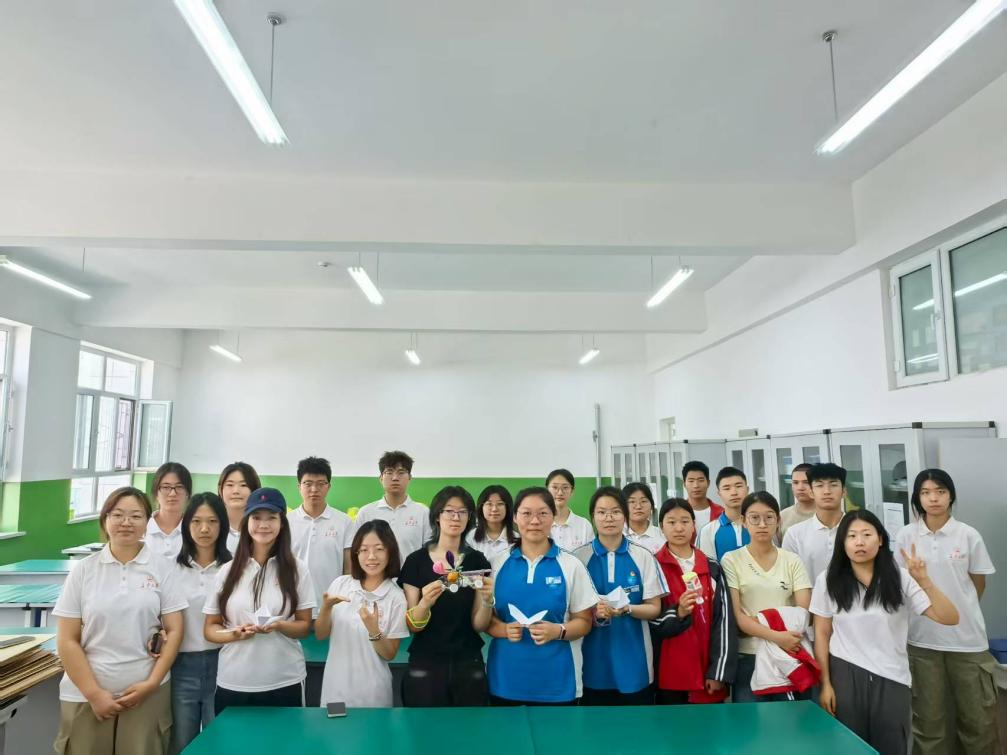 随后进行的科技手工制作则让知识 “落地生根”。旋转飞行器、空气动力车等项目把物理原理与实践操作巧妙结合。实践队成员化身 “指导师”,协助同学们组装、调试,引导大家思考改进方案,并与同学们并肩调试、反复改良。当简易装置成功运转,教室响起的欢呼声,不仅是对成果的喜悦,更是科技思维与动手能力交融的生动见证。