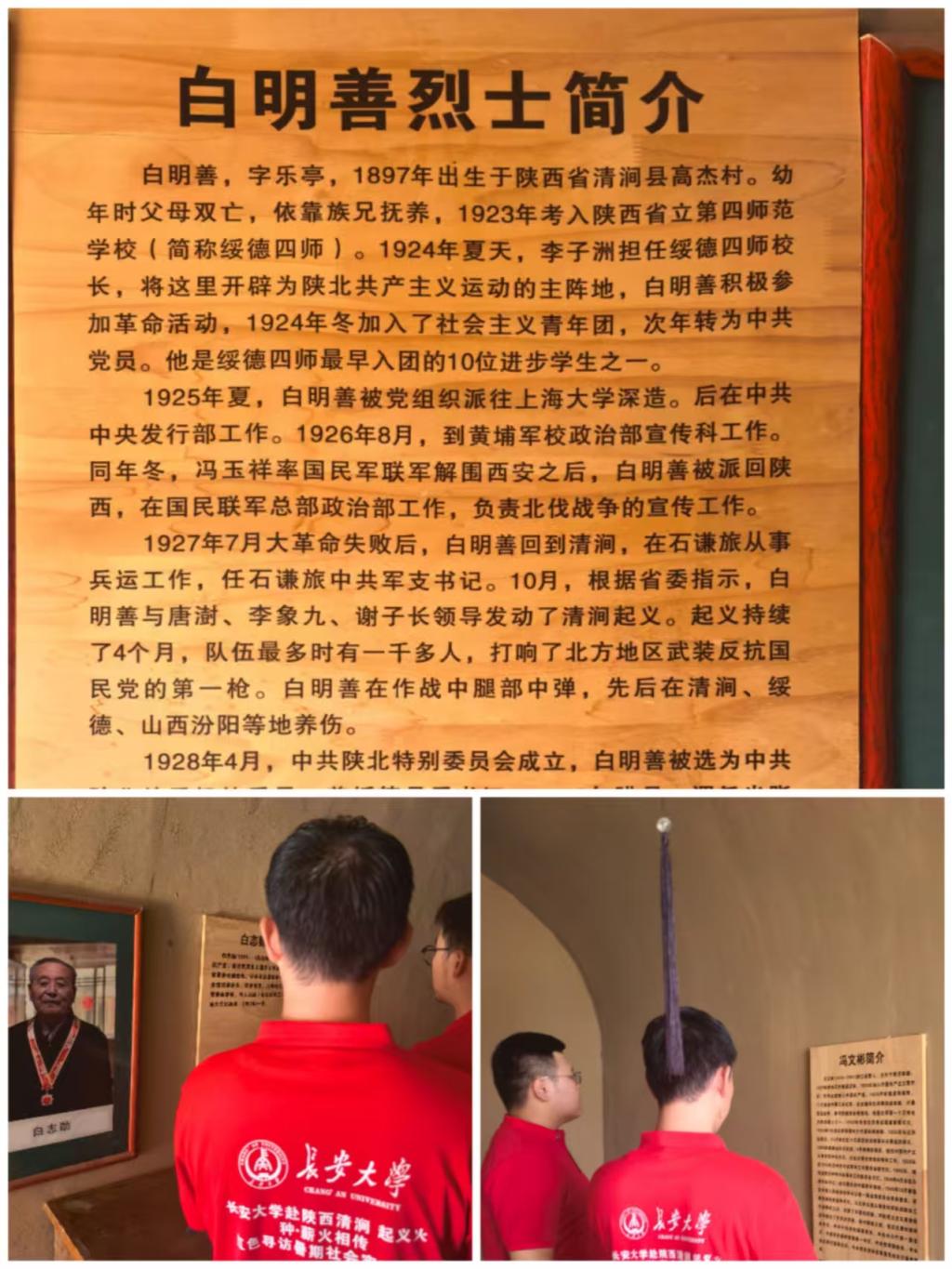在白明善烈士故居的庄重展陈室内,实践队怀着崇敬的心情,聚焦于详实的革命史料。队员们驻足在醒目的木质展板前,认真研读“白明善烈士简介”,通过展板上的黑色文字,详细了解了烈士幼年孤苦、求学绥德四师、受李子洲影响加入青年团并转为中共党员、成为“绥德四师最早入团的十位进步学生之一”的光辉起点,以及他奔赴上海、广州投身革命、回陕参与北伐宣传、组织领导清涧起义并在战斗中负伤的英勇事迹。展板旁,队员们被墙上的历史照片和白底展板内容所吸引:左侧队员凝神观看白明善烈士肖像及生平,右侧队员专注阅读补充资料,沉浸在对烈士革命轨迹的追溯中。这静默而专注的现场,是青春丹心对历史血火岁月的深情凝望。通过此次深入故居核心展区的学习,队员们更直观地触摸到白明善烈士从热血青年到坚定革命者、从莘莘学子到起义领导者的成长轨迹与精神内核,深刻感悟其“为有牺牲多壮志”的坚定信仰与奋斗精神。