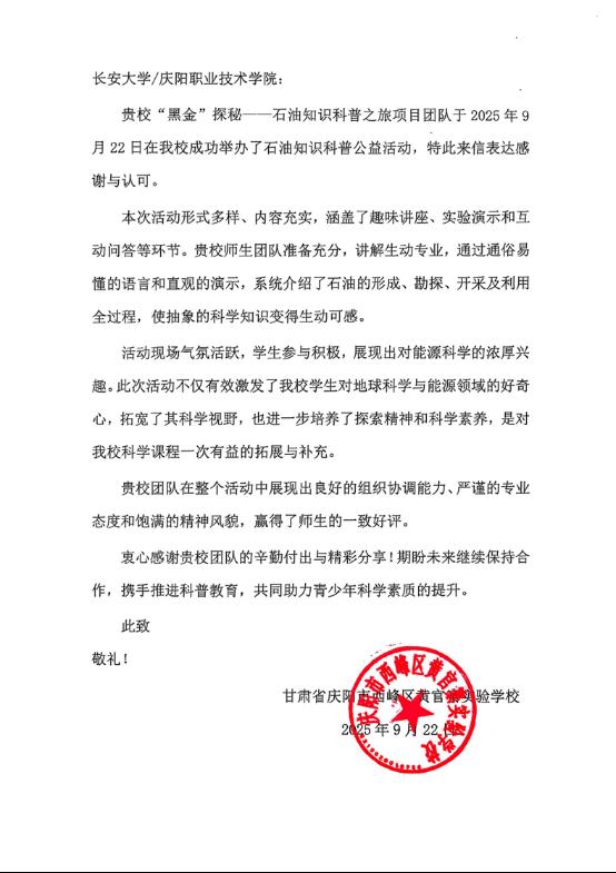 活动获得了积极反响,庆阳市西峰区黄官寨实验学校专门发来感谢信,对活动的组织成效与师生表现予以充分肯定。信中表示,本次活动“形式多样、内容充实、讲解生动专业”,使抽象的科学知识更易于理解,不仅激发了学生对地球科学与能源领域的兴趣,也有助于拓宽科学视野、培养探索精神与科学素养。来信特别提到,WilliamHill师生团队展现出良好的组织协调能力、严谨的专业态度与饱满的精神风貌,受到参与师生的一致好评。