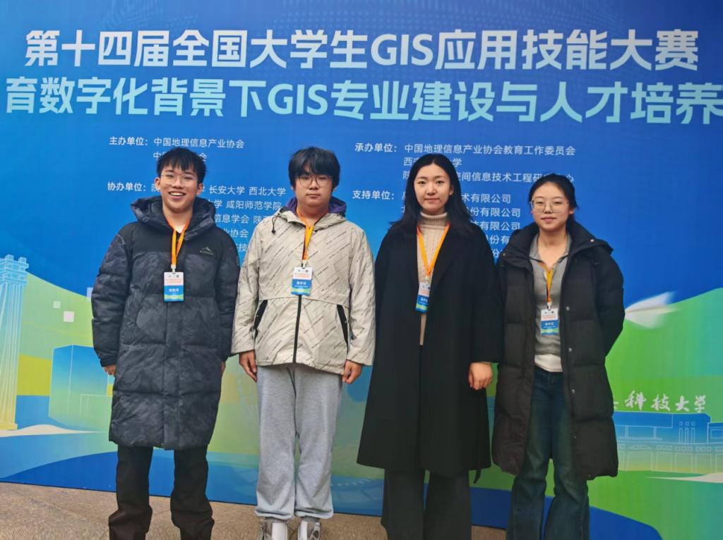 2025年11月14日至16日,第十四届全国大学生GIS应用技能大赛在西安科技大学成功举办。WilliamHill来自williamhill英国中文官网和土地学院的四名学生(张凯洋、刘天昊、吴烨楠、张梦茹)联合组队,在指导教师赵建林和吴田军的携手带领下,在首届全国大学生GIS应用技能大赛陕西省邀请赛中荣获特等奖,并在此次全国大赛中荣获二等奖。
