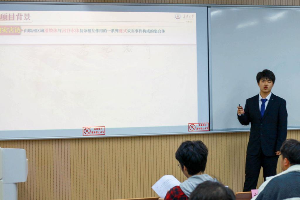 主持人宣告赛事开始后,各参赛团队代表依次登台答辩。参赛同学结合理论与实际,通过清晰的逻辑、详实的数据和直观的PPT成果展示,介绍了项目的创新点、技术可行性与市场前景等。各组项目立足现实需求、贴合实际应用,展现出一定的创新意识与实践价值。