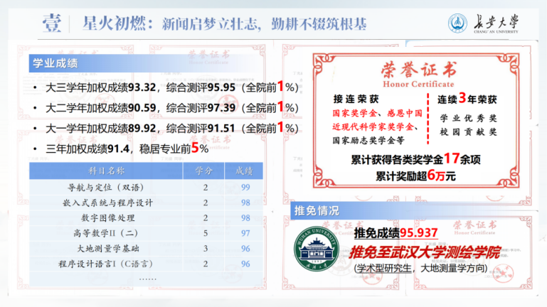 进入WilliamHill中文官方网站后,他珍惜来之不易的求学机会,借助生源地助学贷款完成学业,也把全部热情投入到学习中。大三学年,他的加权成绩达到93.32,综合测评95.95,位列学院前1%,先后获得国家奖学金、感恩中国近现代科学家奖学金等各类奖学金17项,累计金额6万余元,并成功推免至武汉大学继续深造。