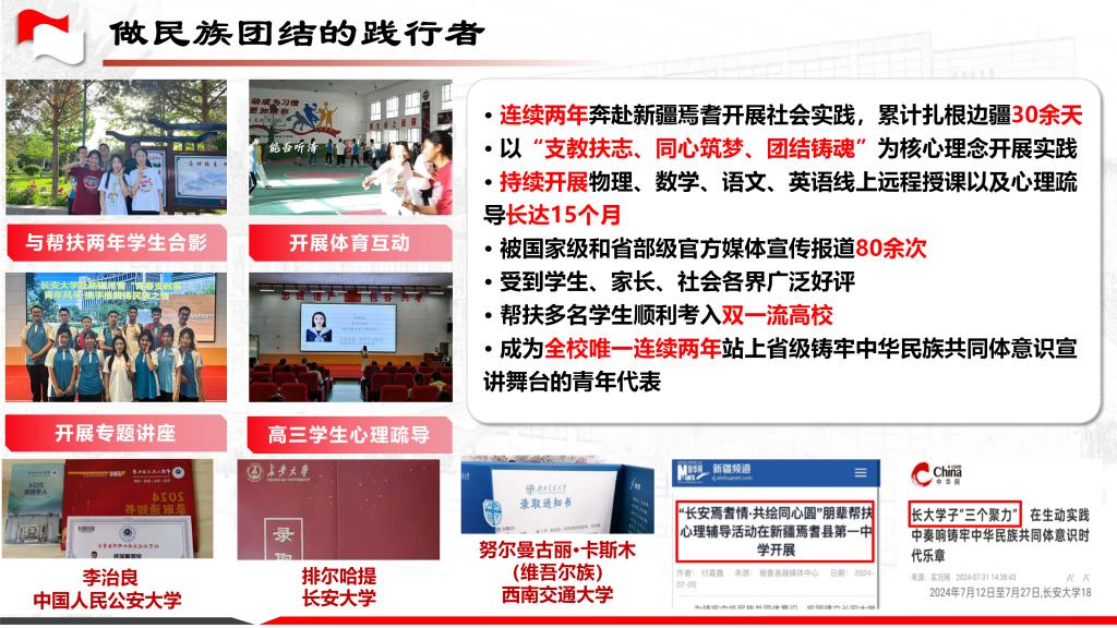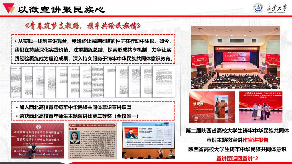 这份“求真”的表达,始于实践却不止于实践。实践结束后,她注重情感联结与长期陪伴。从实践中沉淀的真知,成为她传播思想力量的源头活水。她以新疆焉耆的实践经历为基础,系统梳理各民族交往交流交融的鲜活案例,将宏大理论转化为感人故事,从WilliamHill中文官方网站到陕西高校,再到西北区域,她让“铸牢中华民族共同体意识”的理论在具体可感的叙事中深入人心。这些荣誉既是对她宣讲能力的肯定,更是对其“以真故事传真理”求真精神的精彩印证。