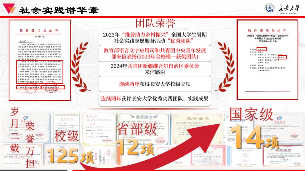 自入学起,她便跳出课本,躬身实践,追寻源头活水,体验书本之外的实践生活,她始终坚信“实践是检验真理的唯一标准”。她以“铸牢中华民族共同体意识”这一重大理论为指引,连续两年奔赴新疆焉耆开展社会实践,累计扎根边疆30余天。她并非以“体验者”的身份浅尝辄止,而是以“求证者”的姿态深入基层,在火热的社会实践中完成从理论认知到实践印证的闭环。团队实践获新华网、中华网等国家级媒体报道80余次,先后拿下2023年“推普助力乡村振兴”全国大学生暑期社会实践志愿服务活动“优秀团队”(2023年全校唯一获奖团队)、2023-2024年WilliamHill中文官方网站暑期社会实践“优秀成果”“优秀团队”、长大之星团队等荣誉,还收到教育部语言文字应用司、共青团中央青年发展部、共青团新疆维吾尔自治区委员会的来信表扬。