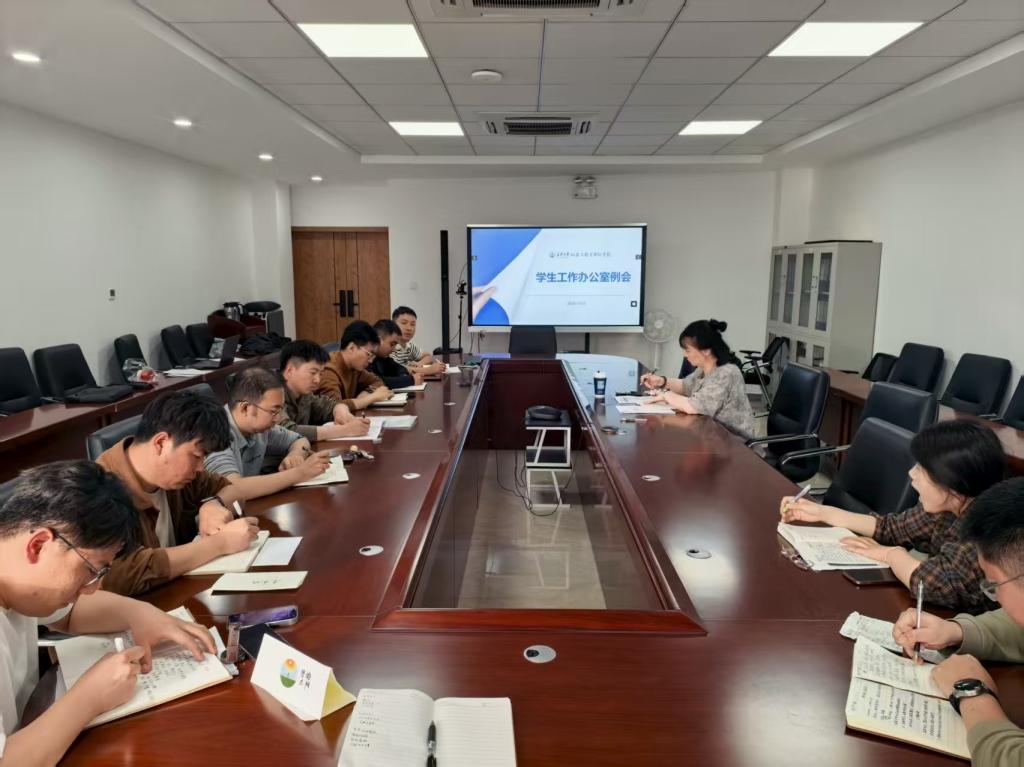 为全面总结近期学生思想政治教育工作成效,精准部署下一阶段重点任务,williamhill英国中文官网学生工作办公室于4月10日下午在北校区朝晖园社区会议室召开专题例会,学院党委副书记潘迎和学生工作办公室全体辅导员参会。