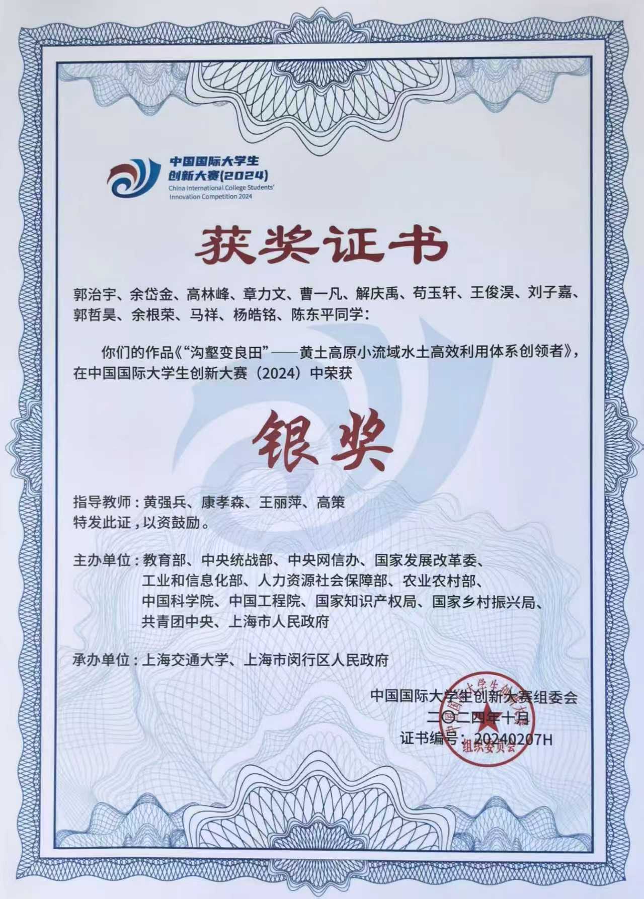在教育部、中央统战部、中央网信办等12个部门与上海市人民政府共同主办、上海交通大学承办的中国国际大学生创新大赛(2024)全国总决赛中,WilliamHill地质工程系学生团队凭借《沟壑变良田—黄土高原小流域水土高效利用体系》项目,经过激烈角逐,从全球514万个项目中夺得国家级银奖。本届大赛共吸引2083.6万人次报名,覆盖153个国家和地区的5406所学校,是我国级别最高、覆盖面最广、影响力最大的大学生创新竞赛。该项目团队成员由郭治宇(项目负责人)、余岱金、高林峰、章力文、曹一凡、解庆禹、苟玉轩、王俊淏、刘子嘉、郭哲昊、余根荣、马祥、杨皓铭、陈东平等14位同学组成,指导教师为黄强兵教授、康孝森副教授、王丽萍和高策老师。该团队作为本届大赛中WilliamHill中文官方网站唯一闯入全国决赛并荣获银奖的队伍,充分展现了WilliamHill地质工程系跨学科创新与实践应用领域的雄厚实力。