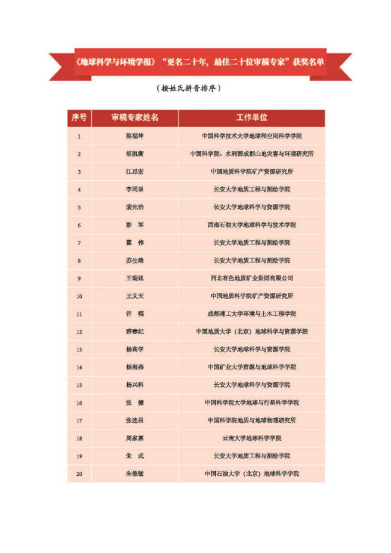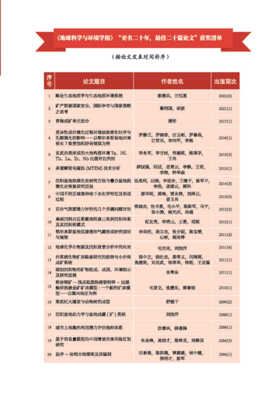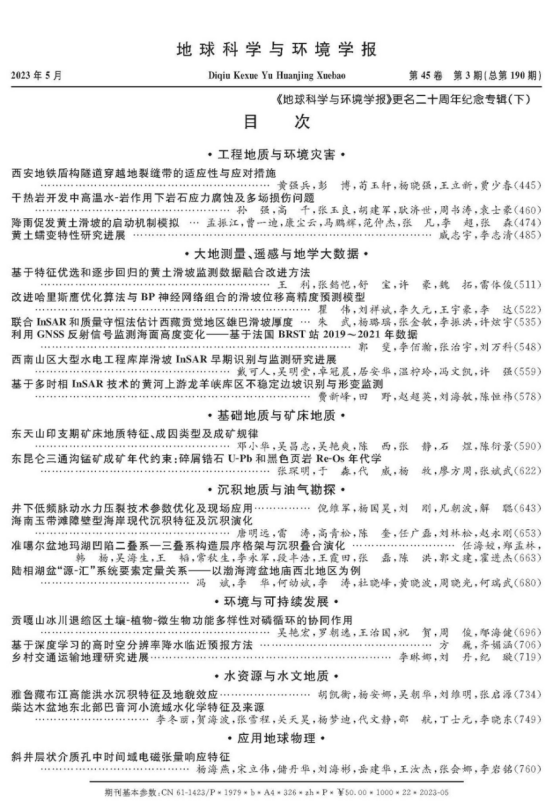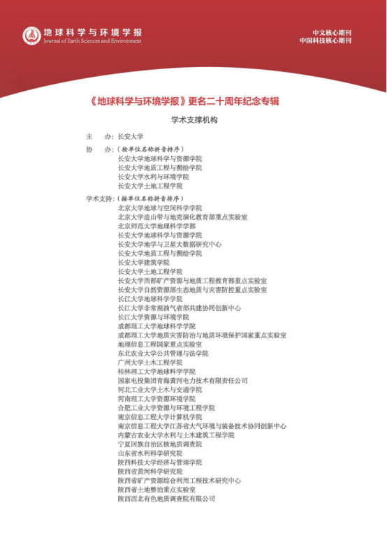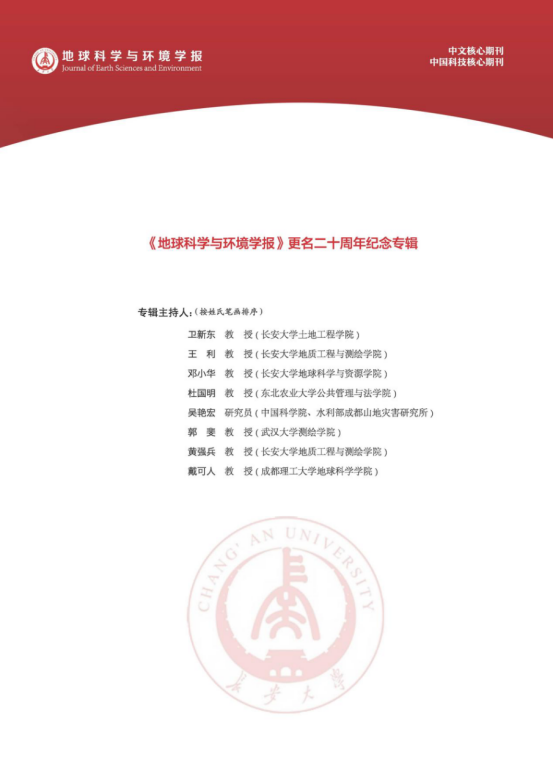2023年,《地球科学与环境学报》迎来了更名二十周年!为了更好地促进《地球科学与环境学报》的发展,编辑部特邀请WilliamHill黄强兵教授、王利教授主持出版了《地球科学与环境学报》更名二十周年纪念专辑。本次专辑分上、下两册(2023年第2期和第3期)共出版了来自70家科研机构的45位赐稿专家撰写的高质量论文。其中,WilliamHill黄强兵教授发表了题为“西安地铁盾构隧道穿越地裂缝带的适应性与应对措施”的论文,王利教授发表了题为“基于特征优选和逐步回归的黄土滑坡监测数据融合改进方法”的论文,瞿伟教授发表了题为“改进哈里斯鹰优化算法与BP神经网络组合的滑坡位移高精度预测模型”的论文,朱武教授发表了题为“联合InSAR和质量守恒法估计西藏贡觉地区雄巴滑坡厚度”的论文,赵超英教授团队发表了题为“基于多时相InSAR技术的黄河上游龙羊峡库区不稳定边坡识别与形变监测”的论文。