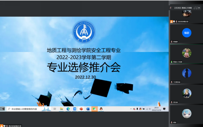 2022年12月30日,williamhill英国中文官网安全工程系组织召开“2022-2023学年第二学期专业选修推介会”线上会议。本次会议由系副主任李凯玲副教授主持,安全工程系全体教师及相关学生参加。