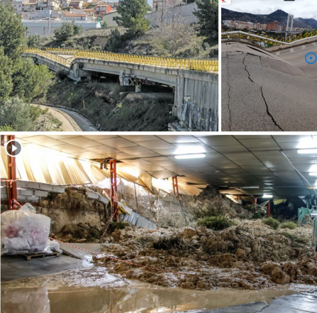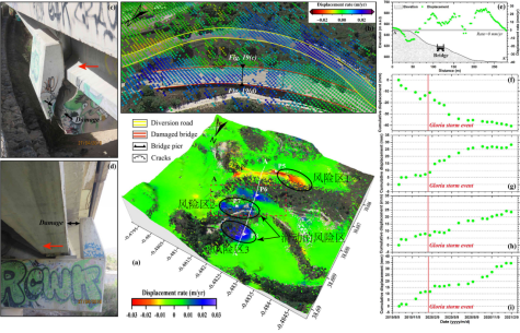 2022年4月初,西班牙东南部Alcoy市连续强降雨,诱发了该市圣地亚哥公园区大型滑坡出现多次局部滑动,摧毁一座桥梁、威胁多座居民楼和一个工厂的安全(如图2)。在该滑坡发生前的10个月,WilliamHill张勤教授研究团队与西班牙阿利坎特Roberto Tomás教授团队合作,利用合成孔径雷达干涉测量技术(InSAR),采用德国TerraSAR-X与西班牙PAZ雷达数据对西班牙Alcoy全市进行了地质灾害早期识别与动态监测,成功探测出41个地质灾害隐患点,结合现场调查划定了三个滑坡高风险区(图3),并对风险区采用InSAR技术进行了动态跟踪监测,最终成功捕获到异常形变现象(图4)。相关研究成果在滑坡发生前多次提交给Alcoy市政管理部门,有效指导该滑坡灾害的管理及防灾减灾工作,避免了人员伤亡与经济损失。