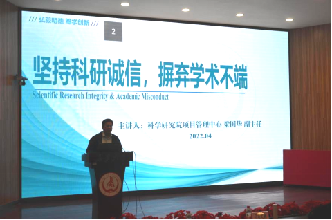 梁国华副主任讲解了学校科研管理相关政策,对科研诚信与学术规范的定义、学术不端的类型、行为规范以及构建科研诚信体系等方面作了介绍,分析了学术不端行为的危害,并从研究人员道德、思想和伦理等方面剖析了产生科研失信行为的主要原因,提醒所有科研人员要始终坚持科研诚信、摒弃学术不端。