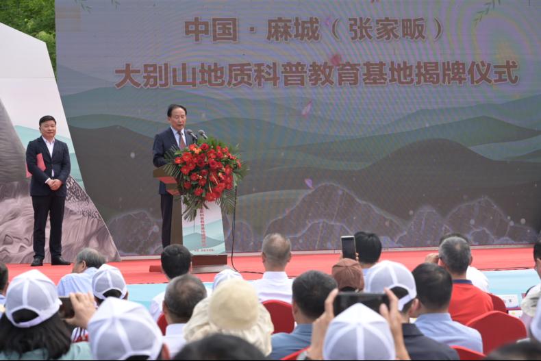 彭建兵院士在讲话中深情回顾了年少求学历程和故乡对自己的精神文化滋养,希望在各方协同推动下,把大别山地质科普教育基地建设成为青少年科学梦想的“金铃铛”、启迪民众科学意识的“金摇篮”、开启农村现代化建设的“金钥匙”。