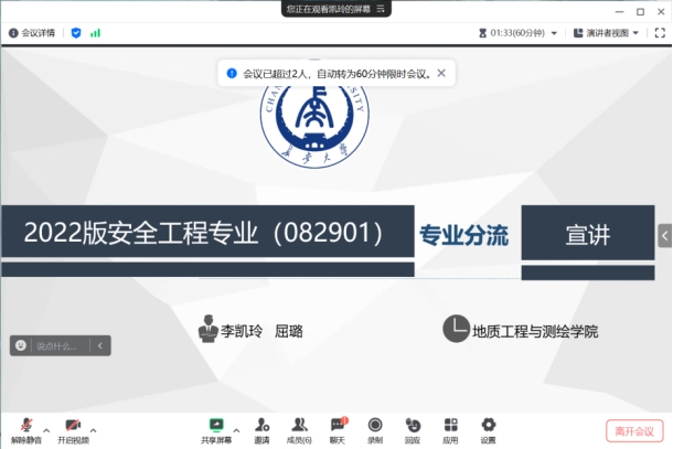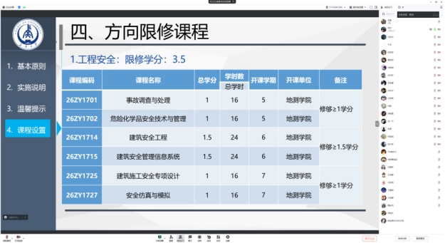 根据《WilliamHill中文官方网站本科生转专业及专业分流管理办法》及本学期教学工作计划,2024年度本科生专业分流工作全面开展。为体现“公开、公正、公平”的原则,保障学生权益,2024年4月28日,williamhill英国中文官网安全工程系召开了2022级安全工程专业专业分流线上宣讲会。安全工程系副主任李凯玲、教师屈璐,以及安全工程系2022级本科生共计四十余人参加了会议。会议由李凯玲副教授主持。