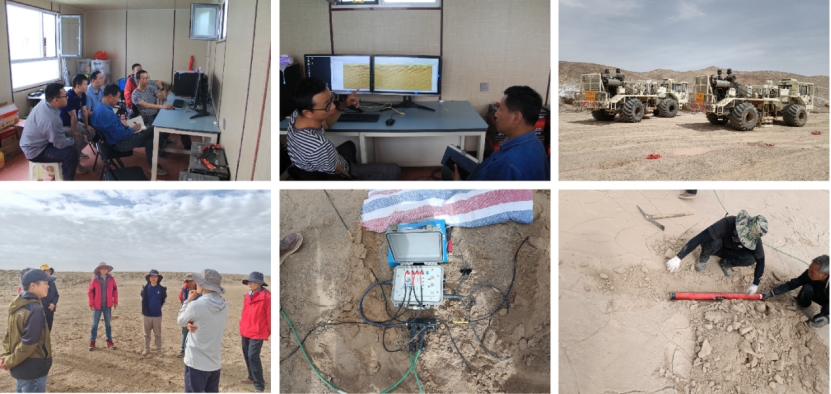 7月12日上午考察大地电磁法野外施工流程,了解施工单位的仪器设备情况及使用经验,并与现场负责人进行交流讨论。12日下午考察地震勘探野外施工情况,参观震源车和采集车现场施工流程,并就初步勘探结果进行探讨。