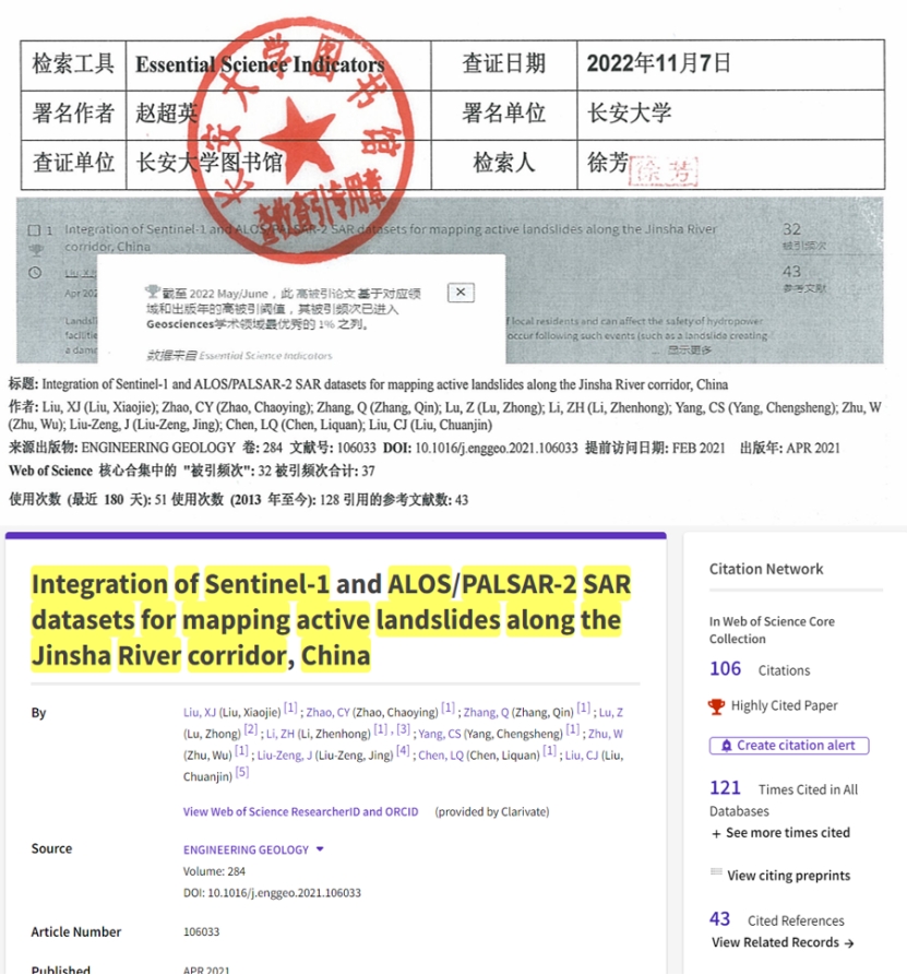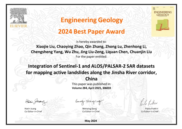 2024年5月10日,地学领域权威学术期刊《Engineering Geology》揭晓了2024年度最佳学术论文奖。WilliamHill赵超英教授团队的研究成果《Integration of Sentinel-1 and ALOS/PALSAR-2 SAR datasets for mapping active landslides along the Jinsha River corridor, China》榜上有名。该奖项是从2021年至2023年间发表的所有论文中评选而出,经过论文总被引次数初选,主编和编辑团队审议而产生,最终仅有六篇论文入选。