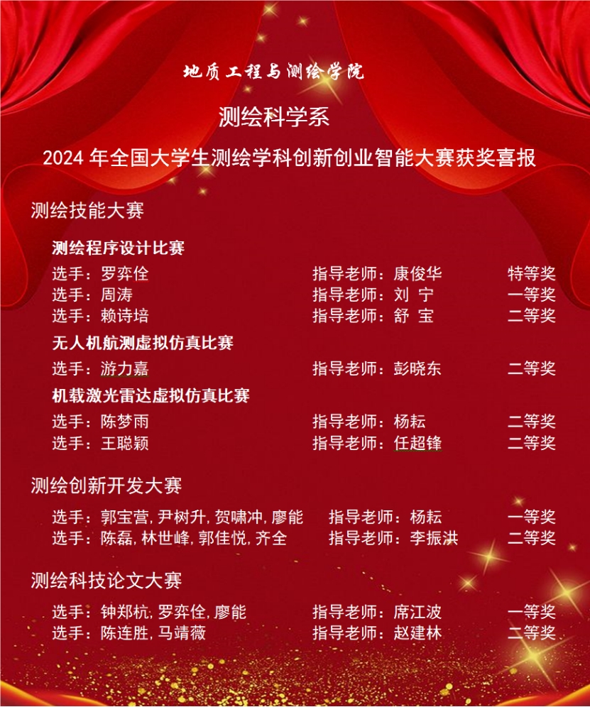 2024年7月31日,教育部高等学校测绘专业教学指导委员会和中国测绘学会教育委员会(以下简称“两委会”)在官方网站公布了“2024全国大学生测绘学科创新创业智能大赛”的获奖名单。WilliamHill中文官方网站取得了特等奖1项,一等奖3项,二等奖6项的好成绩。