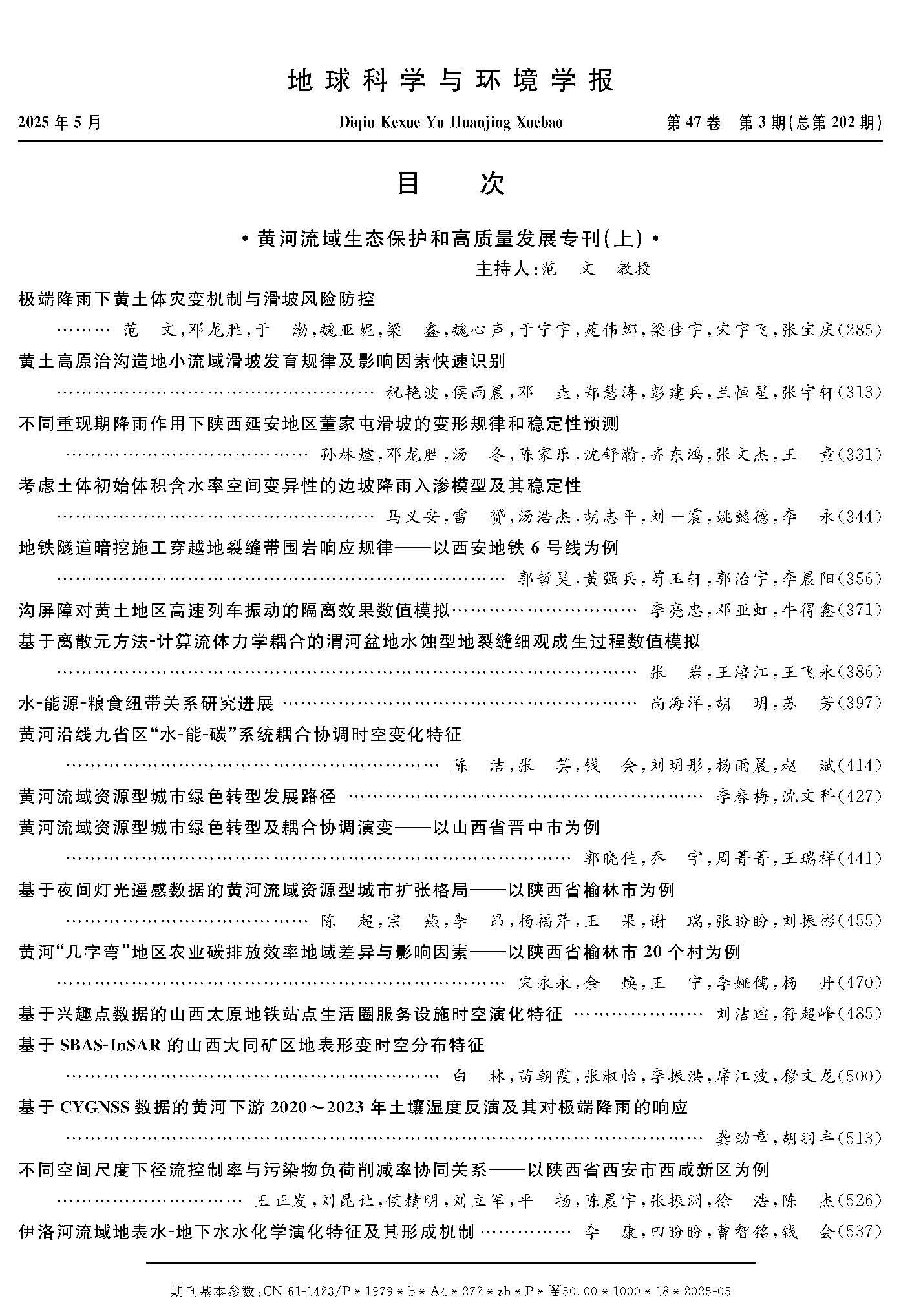本专刊围绕黄河流域复杂地质地表过程、生态环境效应与人地协调、资源型城市绿色转型发展等方面的科学问题开展了广泛报道,分上、下两册(2025年第3期和第4期)共出版38篇高质量论文。其中,范文教授作为专刊主持人,以一作身份发表了题为“极端降雨下黄土体灾变机制与滑坡风险防控”的高质量论文。WilliamHill中文官方网站、陕西师范大学、西北大学、西安理工大学、西安科技大学、西北政法大学、兰州理工大学、甘肃农业大学、山西师范大学等高校和科研院所为本专刊提供了强大的学术支撑。
