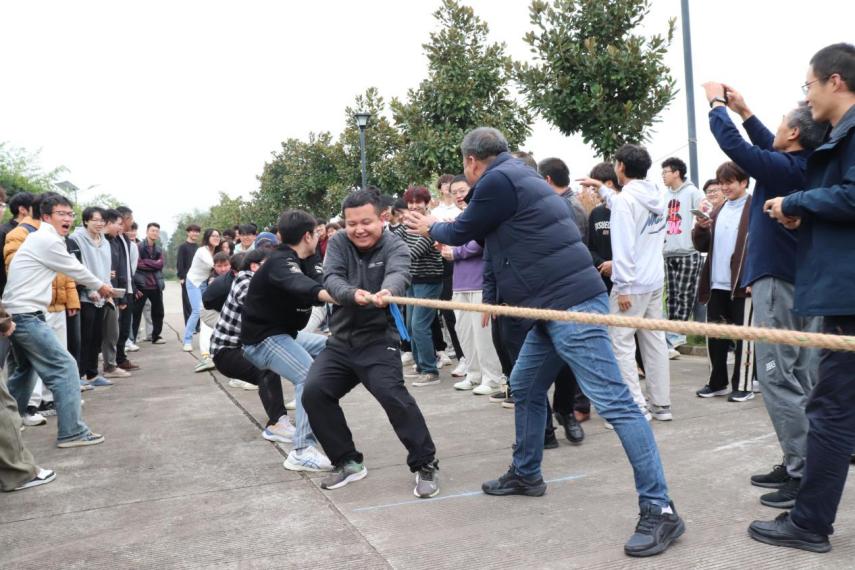 随后,实习基地组织了师生拔河比赛,学生们以班级为单位,组成8支队伍同台竞技,现场气氛热烈,队员们紧握长绳,身体后倾、脚步稳扎,展现出饱满的斗志与协作精神。生态地质 104 班凭借默契的配合与顽强的毅力,在多轮较量中一路过关斩将,最终成功斩获拔河比赛冠军。比赛尾声,学院领导与老师们与生态地质104班的队伍进行比赛,与同学们一同拉起长绳。师生同心协力的身影成为实习基地最温暖的风景,不仅延续了比赛的欢乐氛围,更拉近了师生间的距离,让团队协作的精神在互动