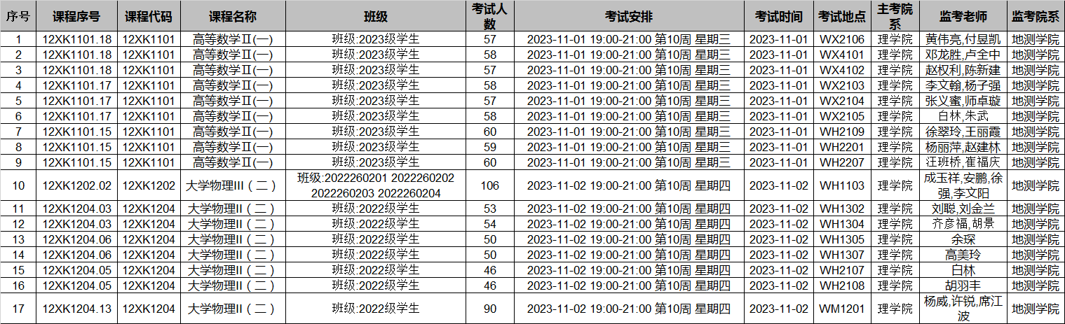 接学校教务通知,2023-2024-1学期高等数学、大学物理期中考试安排已发布,监考安排学院已经在本科教务系统中填报完成(监考教师可同时在本科教务系统中查看监考安排)。为确保考试平稳顺利进行,学院已将相关监考工作安排表格上传到附件中,请各位老师及时下载查阅,并按时完成监考工作。