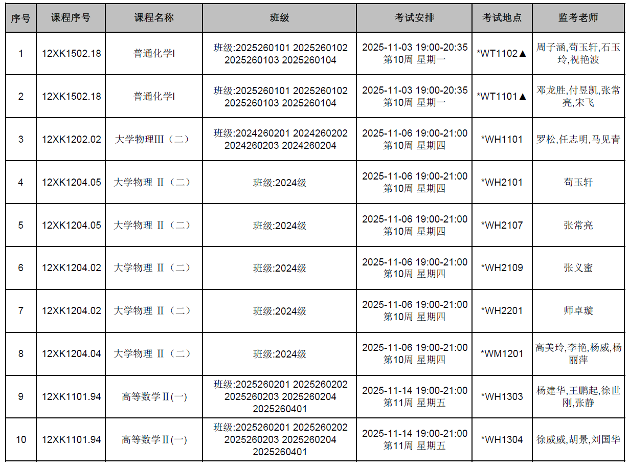 2025-2026-1学期高等数学、大学物理、普通化学期中考试安排已发布,监考安排学院已经在本科教务系统中填报完成(监考教师可同时在本科教务系统中查看监考安排)。为确保考试平稳顺利进行,学院已将相关监考工作安排表上传到附件中,请各位老师及时下载查阅,并按时完成监考工作。