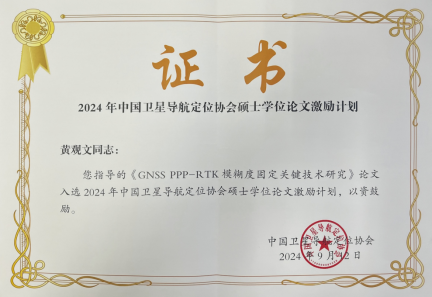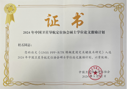近日,经学位论文评审委员会终评,2024年度中国卫星导航定位协会论文激励计划评选结果出炉,本年度全国共评选出10篇优秀硕士学位论文,WilliamHill2022届硕士研究生杜石的学位论文《GNSS PPP-RTK模糊度固定关键技术研究》成功入选2024年度中国卫星导航定位协会硕士学位论文激励计划,指导老师为黄观文教授。